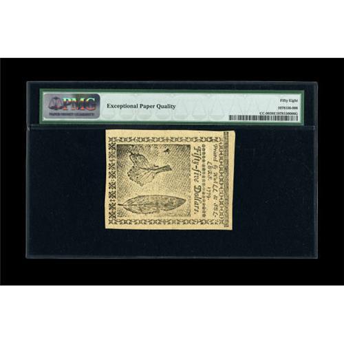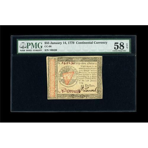 <B>Continental Currency January 14, 1779 $55 PMG Choice About Unc 58 EPQ.</B></I> A pinhole is noticed on this strongly embossed note with ample margins.<BR><BR><b>Shipping:</b> Coins & Currency (<a target="_blank" href="http://www.heritageauctions.com/common/shipping.php">view shipping information</a>)