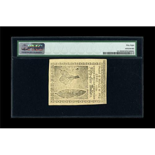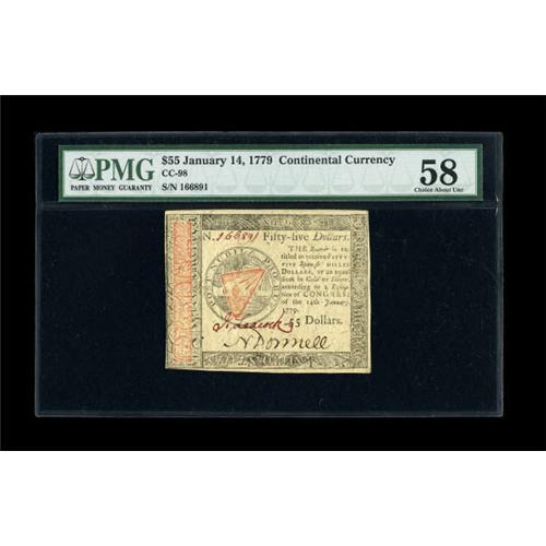 <B>Continental Currency January 14, 1779 $55 PMG Choice About Unc 58.</B></I> Plenty of eye appeal is noticed on this well signed and colorful issue.<BR><BR><b>Shipping:</b> Coins & Currency (<a target="_blank" href="http://www.heritageauctions.com/common/shipping.php">view shipping information</a>)