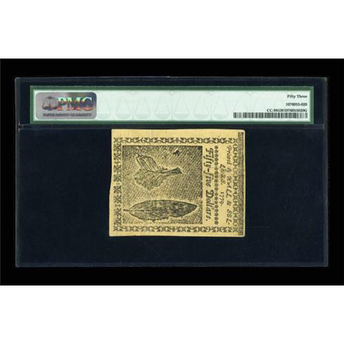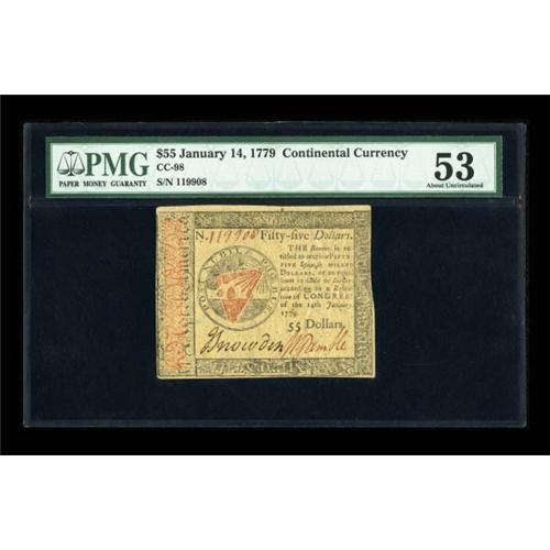 <B>Continental Currency January 14, 1779 $55 PMG About Uncirculated 53.</B></I> This is the only issue that contained this odd denomination. It's rather tightly margined, but with good signatures and an overall nice appearance.<BR><BR><b>Shipping:</b> Coins & Currency (<a target="_blank" href="http://www.heritageauctions.com/common/shipping.php">view shipping information</a>)