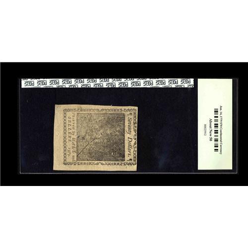 <B>Continental Currency January 14, 1779 $70 PCGS About New 50.</B></I> Free of significant folds, this lightly handled issue features bold signatures.