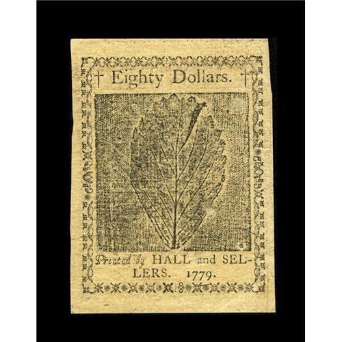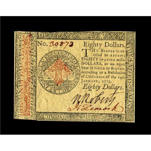 <B>Continental Currency January 14, 1779 $80 Choice About New.</B></I> A very moderate cornerfold is all that separates this note from the Choice New grade. The print quality is excellent and the signatures and serial number superb. But for a couple of tight margins this is an exemplary note for the grade. This highest Continental denomination is always in great demand and commands significant premiums over type notes.<BR><BR><b>Shipping:</b> Coin/Currency (<a target="_blank" href="http://www.heritageauctions.com/common/shipping.php">view shipping information</a>)