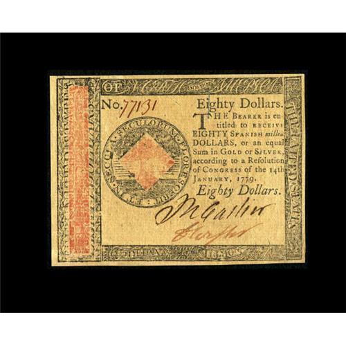 <B>Continental Currency January 14, 1779 $80 Choice About New.</B></I> A pleasing piece with a sheet fold resulting in the About New grade. The paper is perfectly original and all of the details are perfectly printed.<BR><I>From The Collection of a Louisiana Gentleman.</B></I><BR><BR><b>Shipping:</b> Coins & Currency (<a target="_blank" href="http://www.heritageauctions.com/common/shipping.php">view shipping information</a>)