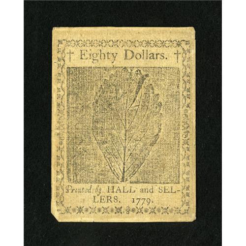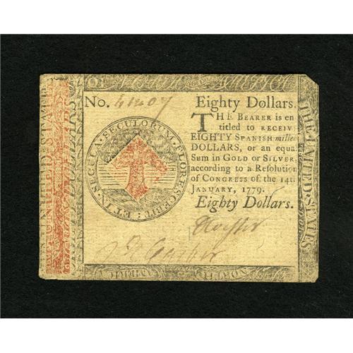 <B>Continental Currency January 14, 1779 $80 Extremely Fine.</B></I> A scarcer denomination that has bold printing and a lightly clipped upper corner.<BR><BR><b>Shipping:</b> Coins & Currency (<a target="_blank" href="http://www.heritageauctions.com/common/shipping.php">view shipping information</a>)