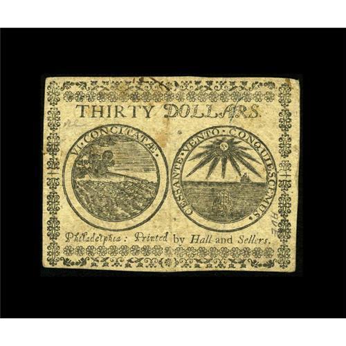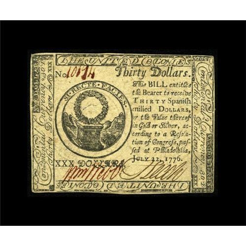 <B>Continental Currency July 22, 1776 $30 About New.</B></I> A very scarce issue that is hard to find in any grade. This pretty example has dark signatures and a center fold.