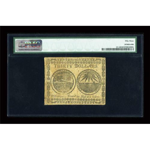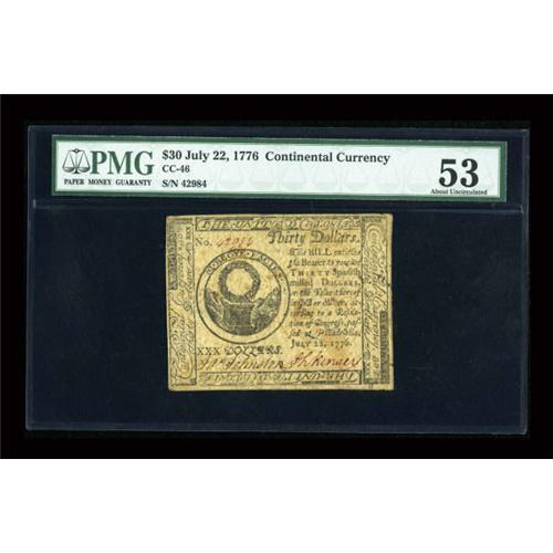 <B>Continental Currency July 22, 1776 $30 PMG About Uncirculated 53.</B></I> Some embossing of the design remains on this lightly circulated piece. Some pinholes are noted, but only when the note is candled.<BR><BR><b>Shipping:</b> Coins & Currency (<a target="_blank" href="http://www.heritageauctions.com/common/shipping.php">view shipping information</a>)