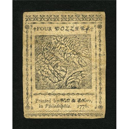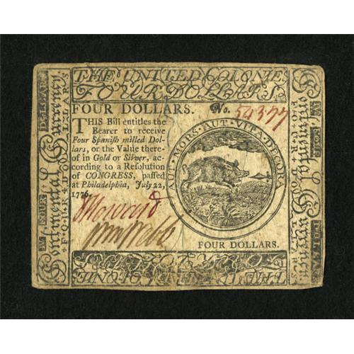<B>Continental Currency July 22, 1776 $4 Very Fine.</B></I> Lightly stained around the edges, but an otherwise very nice example.<BR><BR><b>Shipping:</b> Coins & Currency (<a target="_blank" href="http://www.heritageauctions.com/common/shipping.php">view shipping information</a>)