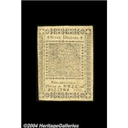 Continental Currency July 22, 1776 $7 Very Fine-Extremely Fine. Boldly signed by Ben Jacobs in deep red ink. This July 22, 1776 issue issue is very underrated, and in our opinion considerably scarcer, than most people realize. This note is perfect for the grade, with its only problem being a top margin that touches the design. <BR><BR><B>Important notice:</B> Heritage usually auctions material at the rate of 200-250 lots per hour. On some occasions eBay Live bid software or the Internet may not be able to keep up with the pace of the auction. We recommend placing a realistic absentee bid now as insurance to avoid disappointment. Occasionally the auctioneer may eliminate or reject an eBay Live bid, and the auctioneer may also reopen a lot after the close of the eBay live bidding (usually because we missed an audience bid), and may reject your bid even if it shows you as the winning bidder. By bidding via eBay Live, you agree that Heritage may award the lot to another bidder at its sole discretion under the circumstances described above or any other reasonable circumstances. Since eBay bids are not shown to us until we open the lot on the floor, we treat those bids just like floor bids. In most cases the floor responds before the eBay bid is presented to us, due to Internet lag time, so for consistency we have made it a policy that floor bids are always considered first over tie eBay live bids. Also please note that all Heritage lots purchased through eBay Live carry a 20% Buyer's Premium. Please make sure you read the Terms and Conditions before you bid. <BR><BR><B>IMPORTANT ANNOUNCEMENT ABOUT RESERVES:</B> Heritage now divulges all reserves on its web site 7 days before every auction. If you want to know whether the reserve on this lot has been met, and if not, what the reserve amount is, please visit this lot page on the HeritageCoin.com web site, or email: bid@HeritageGalleries.com