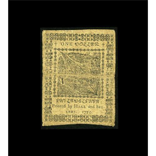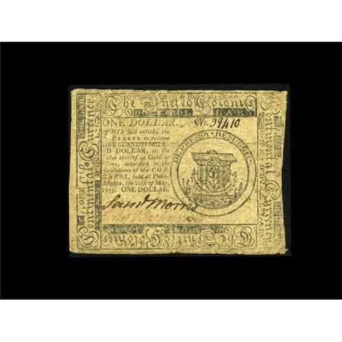 <B>Continental Currency May 10, 1775 $1 Fine.</B></I> A very pleasing and attractive example of the lowest denomination from this scarcer first issue. This has always made this a more desirable and more avidly collected note due to this fact. The signatures are clear and the printing bold for this utterly problem free note.