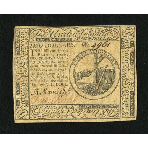 <B>Continental Currency May 10, 1775 $2 Extremely Fine-About New.</B></I> A most attractive Two Dollar from the first of the eleven Continental Currency issues. Well signed, well printed and problem free.<BR><BR><b>Shipping:</b> Coins & Currency (<a target="_blank" href="http://www.heritageauctions.com/common/shipping.php">view shipping information</a>)