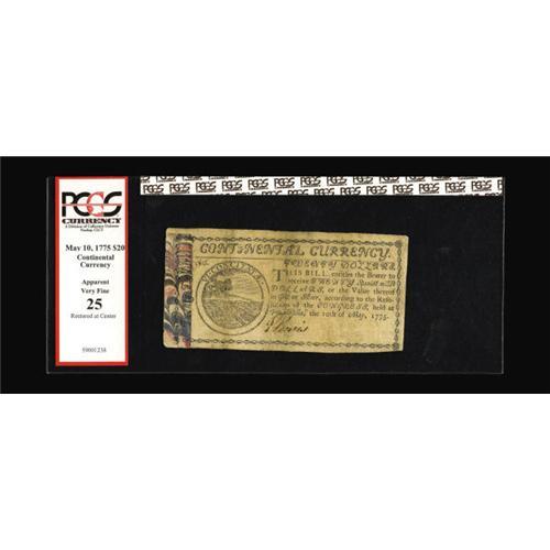 <B>Continental Currency May 10, 1775 $20 PCGS Apparent Very Fine 25, Restored at Center.</B></I> The story behind this unique design is chock-full of events and major players from our Nation's early history. The Continental Congress approved $3,000,000 in notes to be printed for the May 10, 1775 issue, which ultimately comprised of the denominations $1 through $8, $20, and $30. Each of the denominations was uniform in size and approximately 3 3/4 inches by 2 7/8 inches, save for the $20 which was approximately 5 inches by 2 1/2 inches. What's more, the paper on which the $20 notes were printed was a much thinner paper than what was provided by Benjamin Franklin, perhaps suggesting he had some hand in the design of this issue. The left end of each of the $20 bills has a polychrome multicolor anticounterfeiting device, of which the engravings have been attributed directly to David Rittenhouse (first Director of the U.S. Mint as well as noted astronomer and scientist). A total of 11,800 of these colorful notes were printed, compared to 49,000 of most of the other denominations. This particular piece is moderately circulated with the marbled colors remaining sufficiently bright. As with all the known pieces, the back is inverted. The restoration mention on the third party holder may be mostly ignored as the restoration is perhaps one of the most professional jobs we have seen. Both the design and history behind this storied issue rank it No. 79 in the book <I>100 Greatest American Currency Notes.</B></I><BR><I>From The Troy Wiseman Collection</B></I>