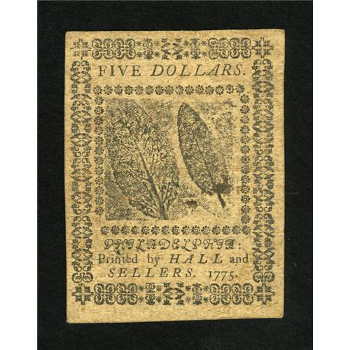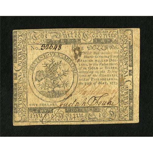 <B>Continental Currency May 10, 1775 $5 Extremely Fine-About New.</B></I> A couple of small spots are noticed on this lightly circulated note.<BR><BR><b>Shipping:</b> Coins & Currency (<a target="_blank" href="http://www.heritageauctions.com/common/shipping.php">view shipping information</a>)