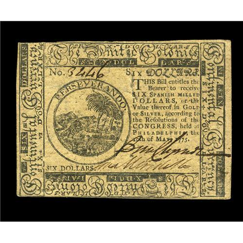 <B>Continental Currency May 10, 1775 $6 Very Choice New.</B></I> A near-Gem example from this earliest Continental Issue. Both signatures are bold and clear. The lower of the two signatures is that of Samuel Meredith, a member of the Continental Congress.
