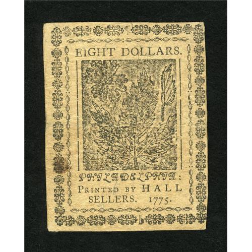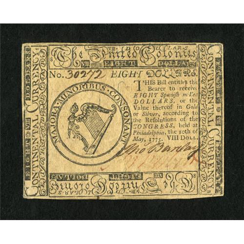 <B>Continental Currency May 10, 1775 $8 Extremely Fine-About New.</B></I> A problem-free example, with good signatures, decent margins and bold printing.<BR><BR><b>Shipping:</b> Coins & Currency (<a target="_blank" href="http://www.heritageauctions.com/common/shipping.php">view shipping information</a>)