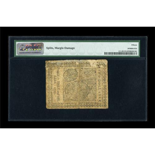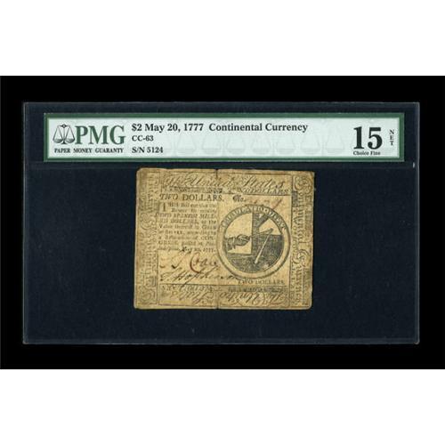 <B>Continental Currency May 20, 1777 $2 PMG Choice Fine 15 Net.</B></I> The design is largely intact. PMG mentions "Splits" and "Margin Damage".<BR><BR><b>Shipping:</b> Coins & Currency (<a target="_blank" href="http://www.heritageauctions.com/common/shipping.php">view shipping information</a>)
