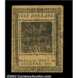Continental Currency May 20, 1777 $6 Choice Extremely Fine. A very nice lightly circulated example from the second rarest Continental Issue. The corners are very slightly rounded, but the margins are exceptional, and both sides are beautifully centered. We've seen collectors wait years to find particular denominations of this issue, yet when they do appear, they seldom realize a price commensurate with their rarity. As Colonial Currency continues to increase in popularity, this pricing anomaly will likely disappear. Important notice: We expect to be auctioning lots at the rate of 200-250 per hour. Sometimes eBay Premier live bid software cannot keep up with that pace, so we strongly recommend that you place a realistic proxy bid now as insurance to avoid disappointment. Also please note that all Heritage/CAA lots purchased through eBay Premier carry a 20% Buyer's Premium. Please make sure you read the Terms and Conditions.