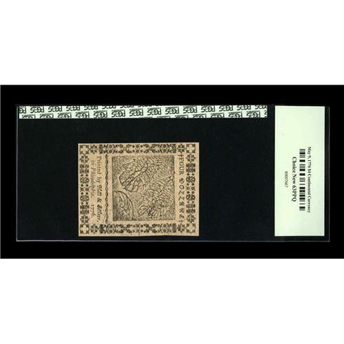 <B>Continental Currency May 9, 1776 $4 PCGS Choice New 63PPQ.</B></I> The margins are a hair tight; otherwise, it's likely that this pretty note would have made it all the way to the Gem grade. It seems ideal in every sense but margin size.