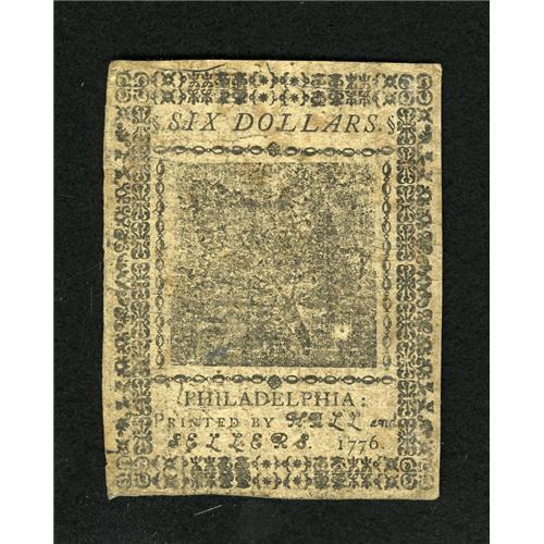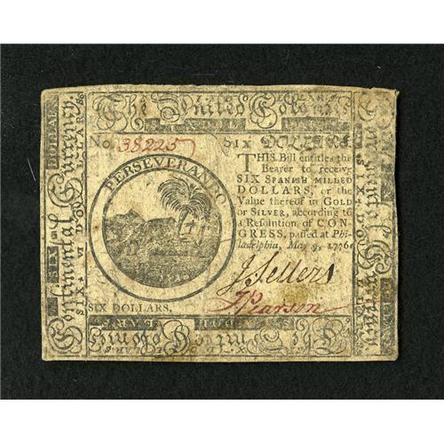 <B>Continental Currency May 9, 1776 $6 Very Fine-Extremely Fine.</B></I> The paper surfaces are really a little too soily for this boldly signed Continental to reach the full Extremely Fine grade.<BR><BR><b>Shipping:</b> Coins & Currency (<a target="_blank" href="http://www.heritageauctions.com/common/shipping.php">view shipping information</a>)