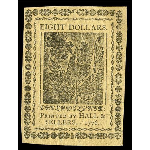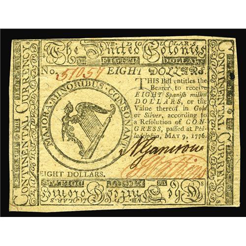 <B>Continental Currency May 9, 1776 $8 Very Choice New.</B></I> Beautifully margined, bright, originally embossed and perfectly signed. The note would be a perfect Gem if the left end of the top margin was just a hair broader.
