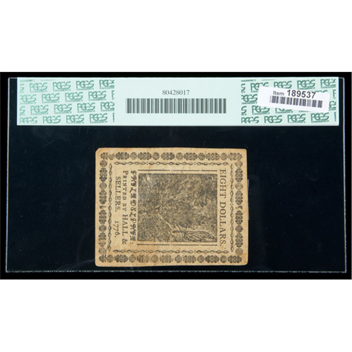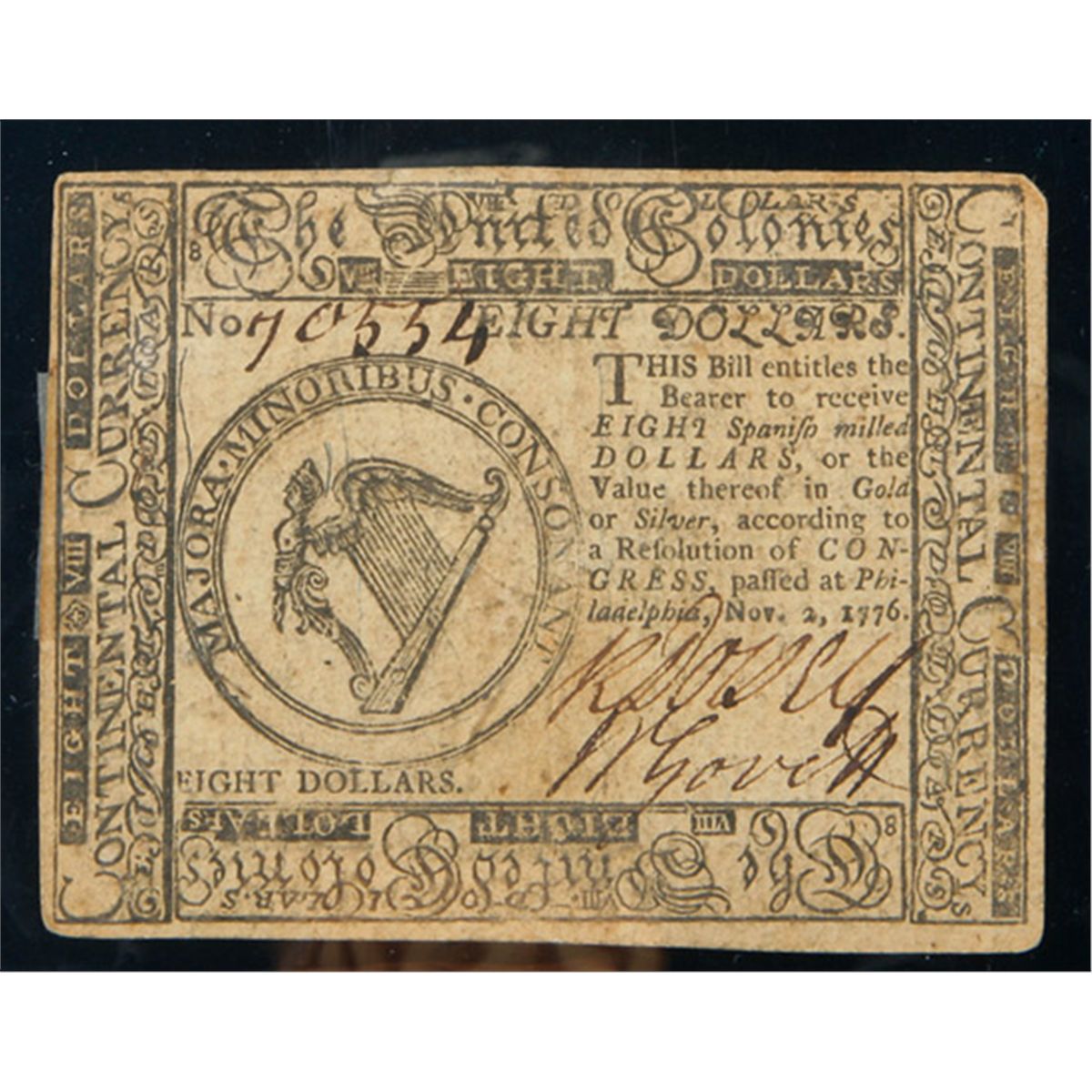 Continental Currency Nov. 2, 1776 $8. PCGS Extremely Fine 40 Apparent. . Fr-CC-53. This $8 example has great eye appeal and is free of any major flaws save for a couple of pieces of tape which are affixed on each end of the face.