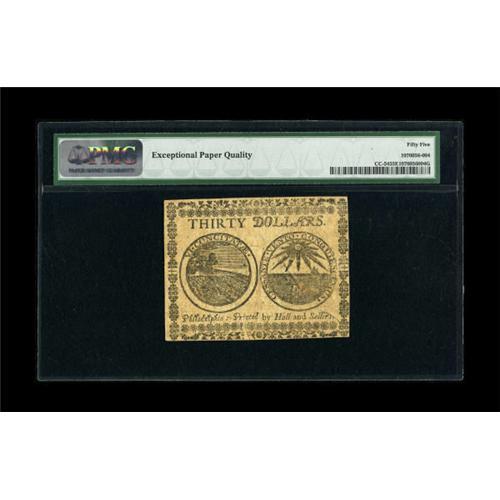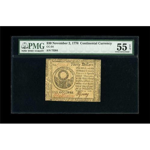 <B>Continental Currency November 2, 1776 $30 PMG About Uncirculated 55 EPQ.</B></I> The red signature is especially bold on this example.<BR><BR><b>Shipping:</b> Coins & Currency (<a target="_blank" href="http://www.heritageauctions.com/common/shipping.php">view shipping information</a>)