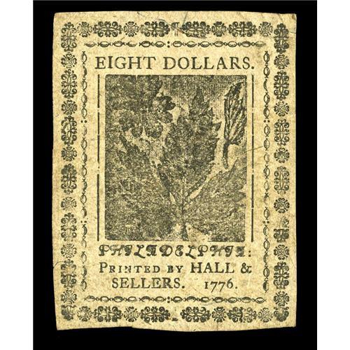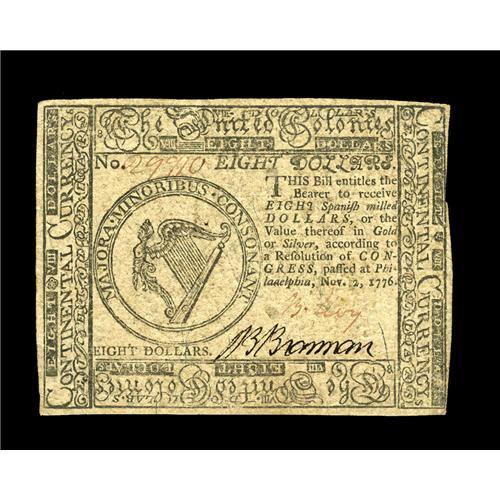<B>Continental Currency November 2, 1776 $8 Choice New.</B></I> The note bears the clear signature of B(enjamin) Levy. It's a very well margined note, and boldly printed, including the nature print.