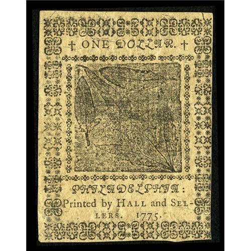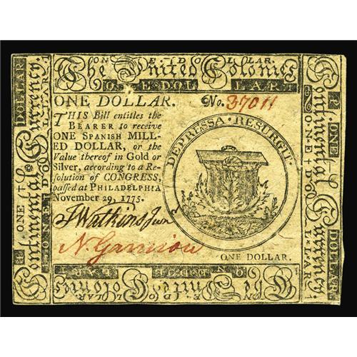 <B>Continental Currency November 29, 1775 $1 Choice New.</B></I> Closely margined all around, but well signed and very bright.