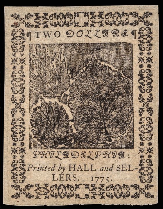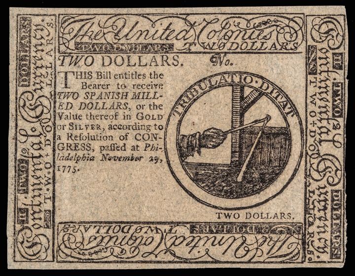 Continental Congress. November 29, 1775. Two Dollars. Blue Paper Detector Note. PMG graded Choice Uncirculated-63.