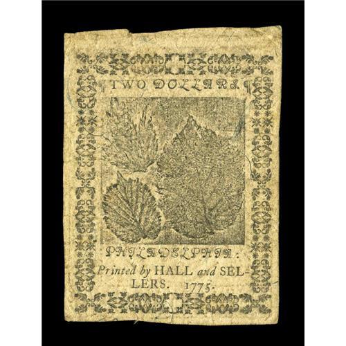 <B>Continental Currency November 29, 1775 $2 Extremely Fine.</B></I> Extraordinarily well margined, with bright colors, bold signatures and perfect print quality. Continentals this pretty are seldom seen on the market.