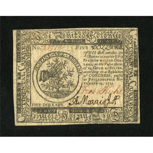 <B>Continental Currency November 29, 1775 $5 About New.</B></I> Dark signatures are found on this lightly handled note.<BR><BR><b>Shipping:</b> Coins & Currency (<a target="_blank" href="http://www.heritageauctions.com/common/shipping.php">view shipping information</a>)
