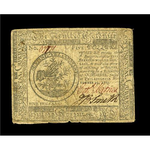 <B>Continental Currency November 29, 1775 $5 Very Fine.</B></I> Well signed and attractive in spite of a fair degree of circulation. The note bears the bold signature of J.B.(Jonathan Bayard) Smith, who was a member of the Continental Congress. This offering has a number of Continental Congress signers in it. Some of these pieces are undoubtedly very rare, and virtually no study of their relative rarity exists.