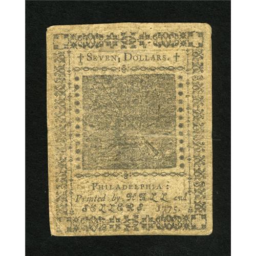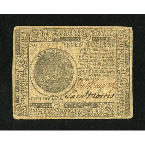 <B>Continental Currency November 29, 1775 $7 Extremely Fine-About New.</B></I> This note was signed by a member of the Continental Congress, John Bayard.<BR><BR><b>Shipping:</b> Coins & Currency (<a target="_blank" href="http://www.heritageauctions.com/common/shipping.php">view shipping information</a>)