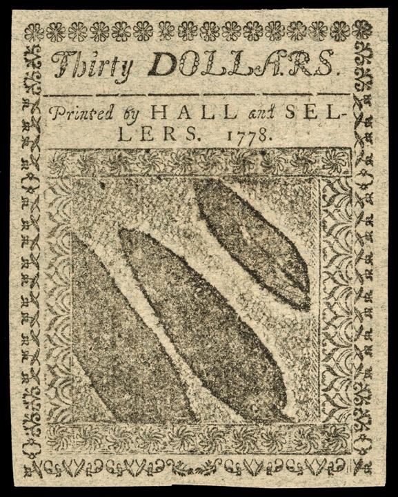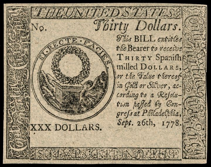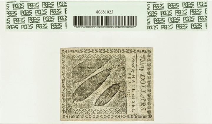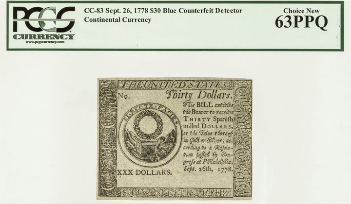 Continental Congress. September 26, 1778. Thirty Dollars. Philadelphia Issue. Blue Paper Detector. PCGS graded Choice New-63 Premium Paper Quality.