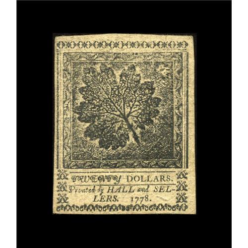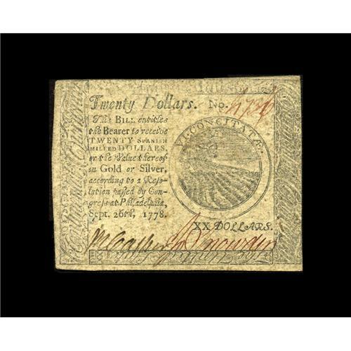 <B>Continental Currency September 26, 1778 $20 About New.</B></I> There is a little surface soil, but the signatures are strong, and the nature print is unusually clear.