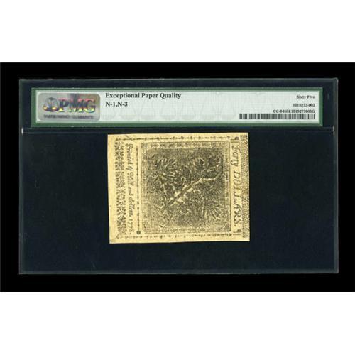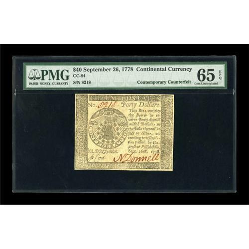 <B>Continental Currency September 26, 1778 $40 Contemporary Counterfeit PMG Gem Uncirculated 65 EPQ.</B></I> Most 1778 contemporary counterfeits are from the highly spurious April 11, 1778 Yorktown issue. This note is boldly signed with clearly original paper surfaces and excellent margins. A regular issue Gem would garner a four-figure price but we suspect this one will not be too far off the mark.<BR><BR><b>Shipping:</b> Coins & Currency (<a target="_blank" href="http://www.heritageauctions.com/common/shipping.php">view shipping information</a>)