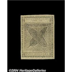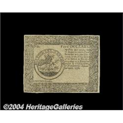 Continental Currency September 26, 1778 $5 Counterfeit Detector Very Choice New. This blue detector note is beautifully margined and flawless save for two as-made paper wrinkles. These detectors were printed from the genuine plates, and they circulated among merchants for the purpose of comparison with suspected counterfeits. They were printed on blue paper to prevent them from being falsely signed and circulated. This is an unusually nice example of the type. <BR><BR><B>Important notice:</B> Heritage usually auctions material at the rate of 200-250 lots per hour. On some occasions eBay Live bid software or the Internet may not be able to keep up with the pace of the auction. We recommend placing a realistic absentee bid now as insurance to avoid disappointment. Occasionally the auctioneer may eliminate or reject an eBay Live bid, and the auctioneer may also reopen a lot after the close of the eBay live bidding (usually because we missed an audience bid), and may reject your bid even if it shows you as the winning bidder. By bidding via eBay Live, you agree that Heritage may award the lot to another bidder at its sole discretion under the circumstances described above or any other reasonable circumstances. Since eBay bids are not shown to us until we open the lot on the floor, we treat those bids just like floor bids. In most cases the floor responds before the eBay bid is presented to us, due to Internet lag time, so for consistency we have made it a policy that floor bids are always considered first over tie eBay live bids. Also please note that all Heritage lots purchased through eBay Live carry a 20% Buyer's Premium. Please make sure you read the Terms and Conditions before you bid. <BR><BR><B>IMPORTANT ANNOUNCEMENT ABOUT RESERVES:</B> Heritage now divulges all reserves on its web site 7 days before every auction. If you want to know whether the reserve on this lot has been met, and if not, what the reserve amount is, please visit this lot page on the HeritageCoin.com web site, or email: bid@HeritageGalleries.com