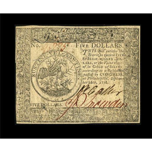 <B>Continental Currency September 26, 1778 $5 Choice New.</B></I> The margin is cut into the design along the left side on this otherwise pleasing note.<BR><BR><b>Shipping:</b> Coins & Currency (<a target="_blank" href="http://www.heritageauctions.com/common/shipping.php">view shipping information</a>)