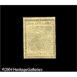 Continental Currency September 26, 1778 $60 Choice Abou <B>Continental Currency September 26, 1778 $60 Choice About New.</B></I> A lovely example with strong signatures, a bold red serial number and better than average centering. <BR><BR><B>Important notice:</B> Heritage usually auctions material at the rate of 200-250 lots per hour. On some occasions eBay Live bid software or the Internet may not be able to keep up with the pace of the auction. We recommend placing a realistic absentee bid now as insurance to avoid disappointment. Occasionally the auctioneer may eliminate or reject an eBay Live bid, and the auctioneer may also reopen a lot after the close of the eBay live bidding (usually because we missed an audience bid), and may reject your bid even if it shows you as the winning bidder. By bidding via eBay Live, you agree that Heritage may award the lot to another bidder at its sole discretion under the circumstances described above or any other reasonable circumstances. Since eBay bids are not shown to us until we open the lot on the floor, we treat those bids just like floor bids. In most cases the floor responds before the eBay bid is presented to us, due to Internet lag time, so for consistency we have made it a policy that floor bids are always considered first over tie eBay live bids. Also please note that all Heritage lots purchased through eBay Live carry a 20% Buyer's Premium. Please make sure you read the Terms and Conditions before you bid. This lot is being auctioned in conjunction with a live floor auction by Heritage Galleries & Auctioneers. All final auction and invoice information will be supplied by Heritage Galleries & Auctioneers, and all other information should be considered preliminary. Lot:15071