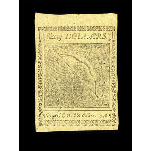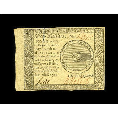 <B>Continental Currency September 26, 1778 $60 Choice About New.</B></I> Light circulation is evident on this higher denomination Continental note that has excellent margins and superb eye appeal.<BR><BR><b>Shipping:</b> Coin/Currency (<a target="_blank" href="http://www.heritageauctions.com/common/shipping.php">view shipping information</a>)