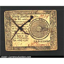 Continental Currency September 26, 1778 $60 Contemporary Counterfeit About New.<p>One of the more deceptive counterfeits of Continental Currency, this one has been marked with a bold "X" indicating its status. The "X" was broadly made in acidic ink that has largely eaten-away the paper that it contacted. Interesting and historic. Important notice: We expect to be auctioning lots at the rate of 200-250 per hour. Sometimes eBay Premier live bid software cannot keep up with that pace, so we strongly recommend that you place a realistic proxy bid now as insurance to avoid disappointment. Also please note that all Heritage/CAA lots purchased through eBay Premier carry a 20% Buyer's Premium.