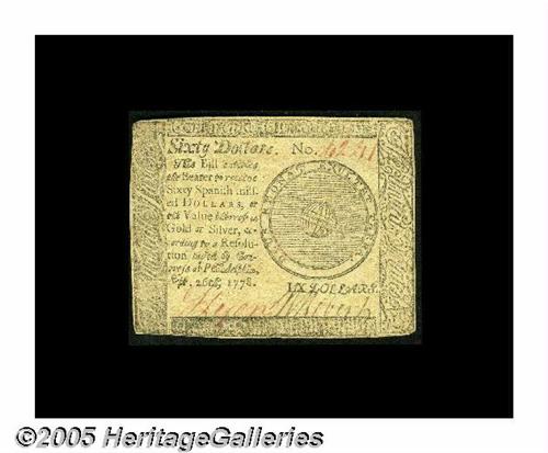 <B>Continental Currency September 26, 1778 $60 Extremely Fine.</B></I> This is the first $60 Continental Issue, and it's a nice lightly circulated example with strong signature and an attractive overall appearance.