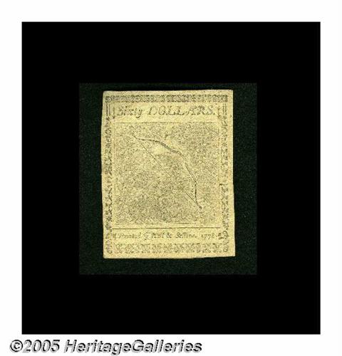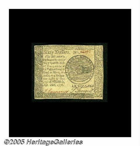 <B>Continental Currency September 26, 1778 $60 Very Choice New.</B></I> A near-Gem example with decent margins and extremely sharp printing quality to the face. The back is not quite as well centered.