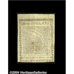 Continental Currency September 26, 1778 $60 Counterfeit Detector Extremely Fine. A blue-paper detector note that has picked up a few folds over the years. It has excellent eye appeal, and it's an inexpensive way to represent a rare type. Most collectors try to obtain a single counterfeit detector. It's an ideal association item for a Continental set. <BR><BR><B>Important notice:</B> Heritage usually auctions material at the rate of 200-250 lots per hour. On some occasions eBay Live bid software or the Internet may not be able to keep up with the pace of the auction. We recommend placing a realistic absentee bid now as insurance to avoid disappointment. Occasionally the auctioneer may eliminate or reject an eBay Live bid, and the auctioneer may also reopen a lot after the close of the eBay live bidding (usually because we missed an audience bid), and may reject your bid even if it shows you as the winning bidder. By bidding via eBay Live, you agree that Heritage may award the lot to another bidder at its sole discretion under the circumstances described above or any other reasonable circumstances. Since eBay bids are not shown to us until we open the lot on the floor, we treat those bids just like floor bids. In most cases the floor responds before the eBay bid is presented to us, due to Internet lag time, so for consistency we have made it a policy that floor bids are always considered first over tie eBay live bids. Also please note that all Heritage lots purchased through eBay Live carry a 20% Buyer's Premium. Please make sure you read the Terms and Conditions before you bid. <BR><BR><B>IMPORTANT ANNOUNCEMENT ABOUT RESERVES:</B> Heritage now divulges all reserves on its web site 7 days before every auction. If you want to know whether the reserve on this lot has been met, and if not, what the reserve amount is, please visit this lot page on the HeritageCoin.com web site, or email: bid@HeritageGalleries.com