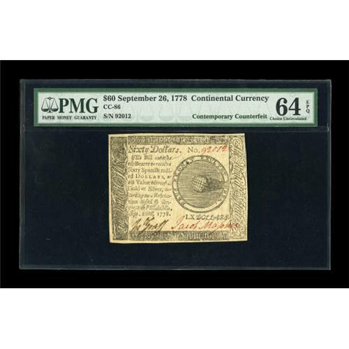 <B>Continental Currency September 26, 1778 $60 Contemporary Counterfeit PMG Choice Uncirculated 64 EPQ.</B></I> The margins are a bit tight on the right but present all around. The signatures are strong, and the original embossing, which has earned this note its EPQ designation, can be easily seen through the third-party holder. This is a contemporary counterfeit that will fit rather nicely into any specialist's collection.<BR><BR><b>Shipping:</b> Coins & Currency (<a target="_blank" href="http://www.heritageauctions.com/common/shipping.php">view shipping information</a>)