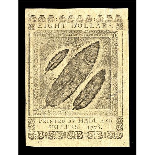 <B>Continental Currency September 26, 1778 $8 Choice About New.</B></I> A sheet-fold 1/4 inch in from the left-end is all that holds this well-printed, beautifully margined Continental away from Gem.