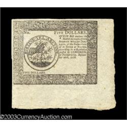 <TABLE cellSpacing=0 cellPadding=0 width="100%" bgColor=#000000 border=0><TBODY> <TR><TD width="100%"><TABLE cellSpacing=1 cellPadding=3 width="100%" border=0><TBODY><TR><TD width="100%" bgColor=#79735c><FONT face=arial color=#ffffff size=3><B>Description</B> </FONT></TD></TR><TR><TD width="100%" bgColor=#ffffff><FONT face=arial size=2><B>Continental Currency September 26, 1778 Blue Counterfeit Detector $5 Very Choice New.</B></I> A lovely detector note with a few very light foxing marks and a partial sheet fold near one edge. Boldly printed and historic. These were distributed for the purpose of comparison with suspected notes to detect counterfeits. The purpose of the blue paper was to prevent the notes from being falsely filled in and spent. (600--up) </FONT></TD></TR></TBODY></TABLE></TD></TR></TBODY></TABLE><BR><TABLE cellSpacing=0 cellPadding=0 width="100%" bgColor=#000000 border=0><TBODY><TR> Important notice: Heritage usually auctions material at the rate of 200-250 lots per hour. On some occasions eBay Live bid software or the Internet may not be able to keep up with the pace of the auction. We recommend placing a realistic absentee bid now as insurance to avoid disappointment. Occasionally the auctioneer may eliminate or reject an eBay Live bid, and the auctioneer may also reopen a lot after the close of the eBay live bidding (usually because we missed an audience bid), and may reject your bid even if it shows you as the winning bidder. By bidding via eBay Live, you agree that Heritage may award the lot to another bidder at its sole discretion under the circumstances described above or any other reasonable circumstances. Also please note that all Heritage lots purchased through eBay Live carry a 20% Buyer's Premium. Please make sure you read the Terms and Conditions before you bid.</TR></TBODY></TABLE>