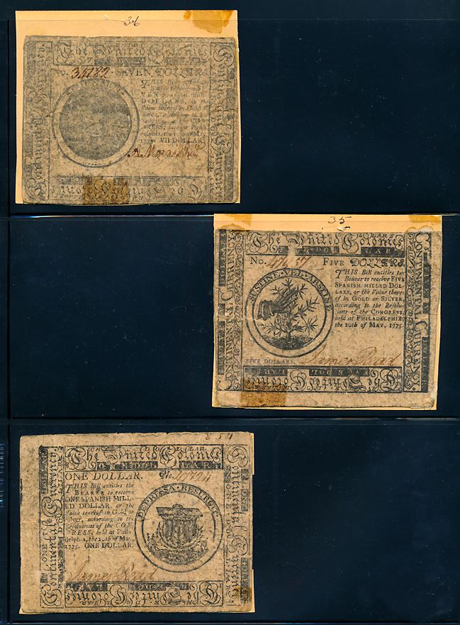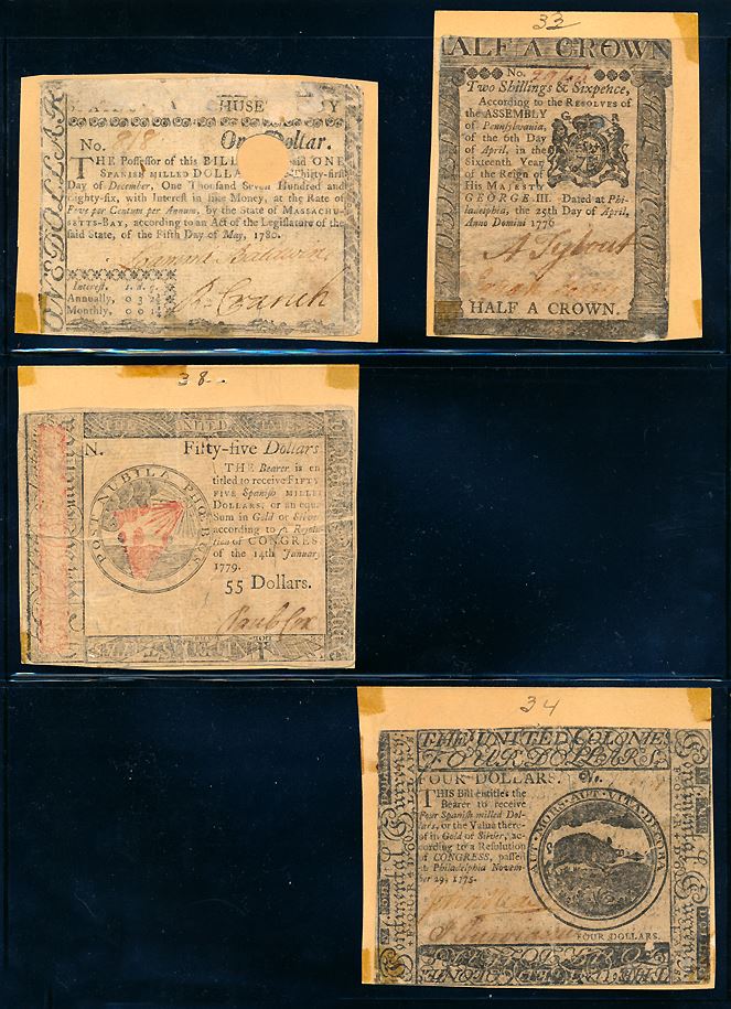 Continental Congress, Philadelphia, May 10th, 1775, $1; $5; $7; November 29th, 1775, $4; January 14th, 1779, $55; Massachusetts, 5th May, 1780, $1, punch cancelled; Pennsylvania, 25th April, 1776, 2 Shillings, 6 Pence, or Half Crown; The notes all grade Fine, or thereabouts for paper quality, but all have been mounted, either on the corners, or fully backed by card stock. Tape remnants are also present. A budget priced lot of 18th Century currency.