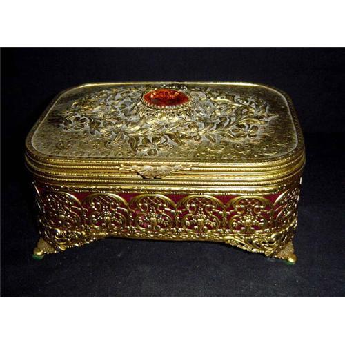 Continental Gilt Jewelry Box Circa. 1900 Completely lined in velvet, with inside tray. Bohemian glass amber color set into lid.
