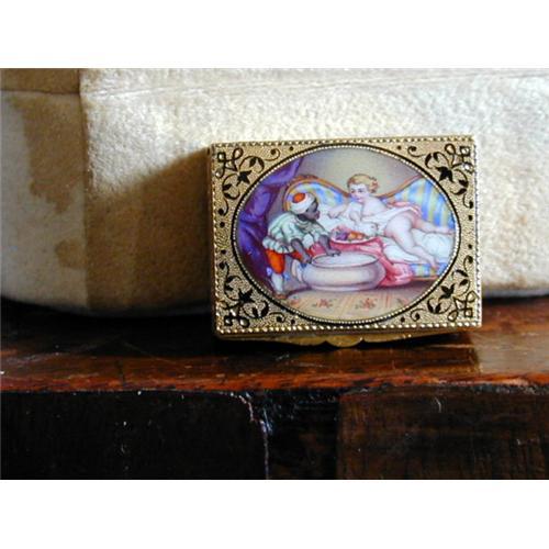 It is not marked but it tests 18 kt or more. The top is decorated with a servant preparing a bath for her mistress.