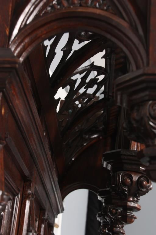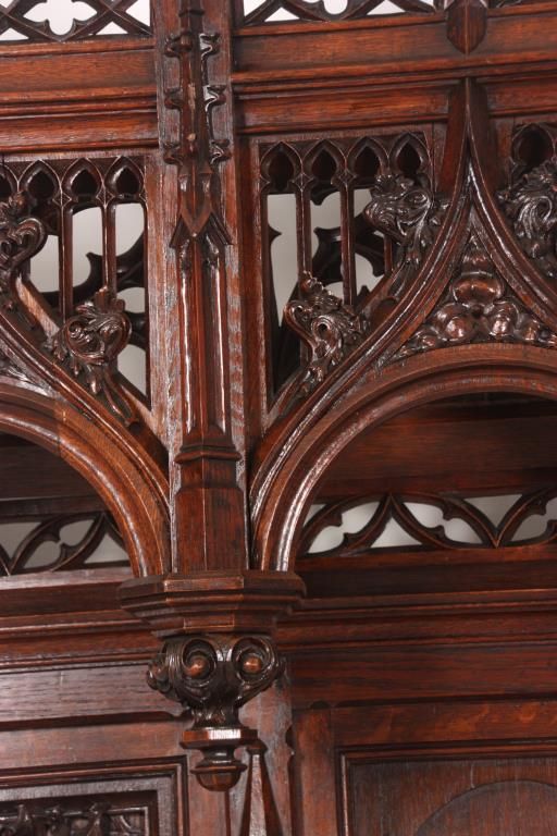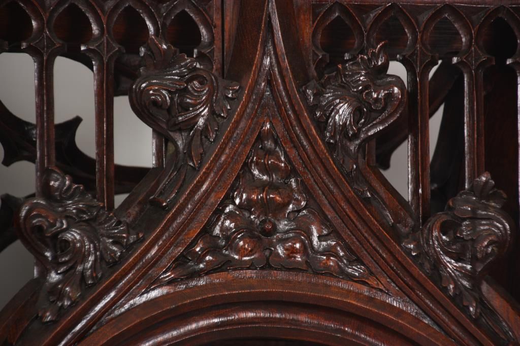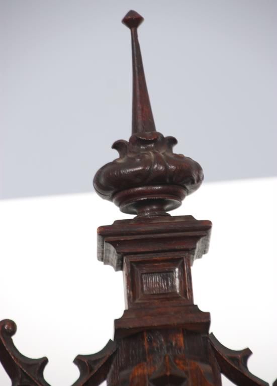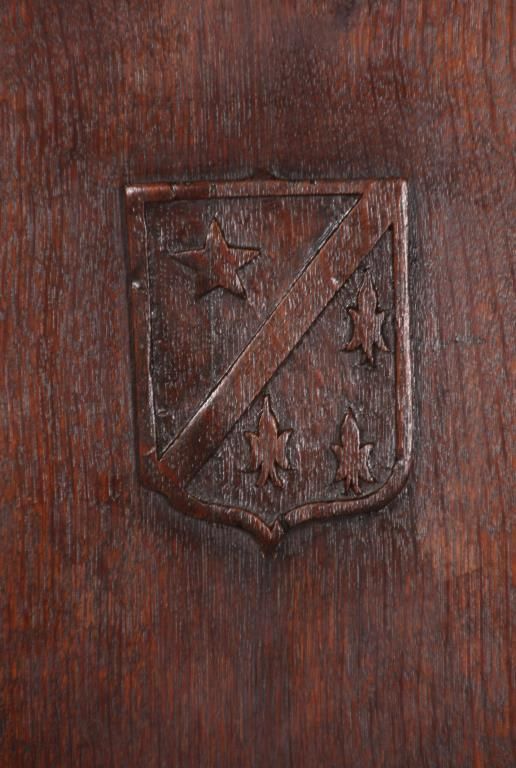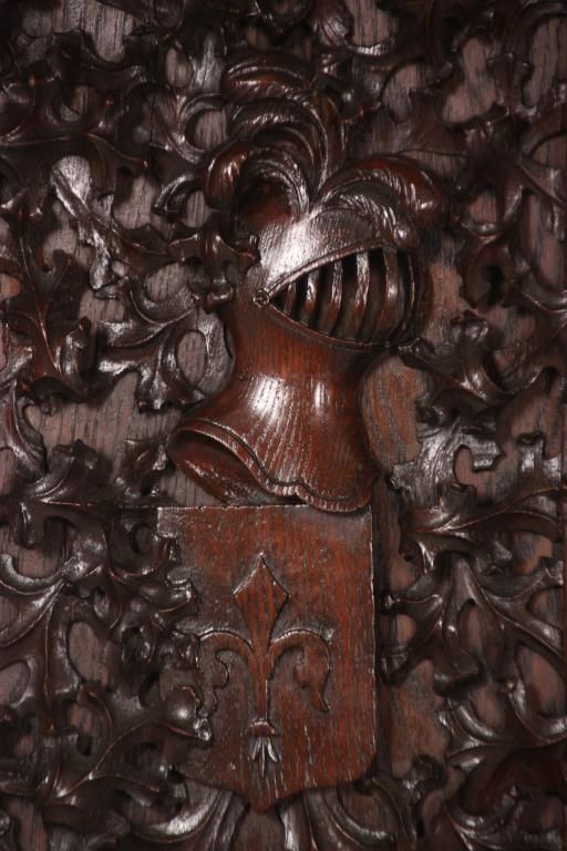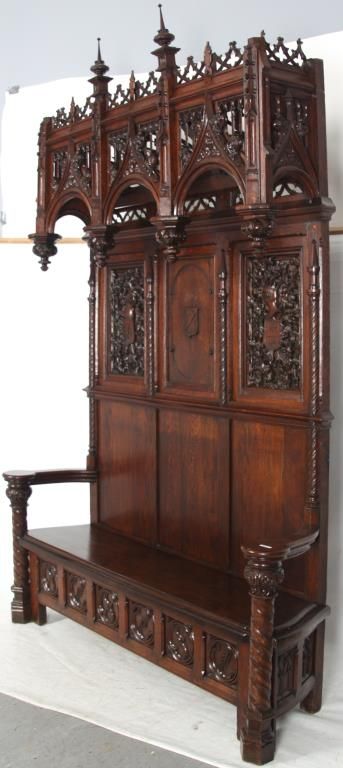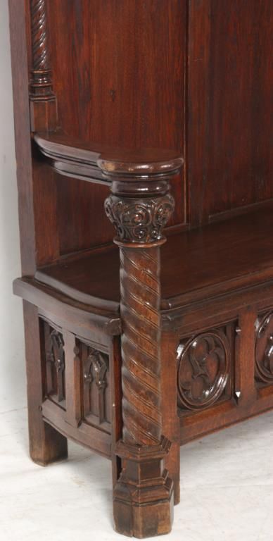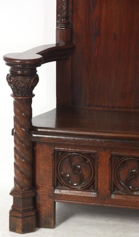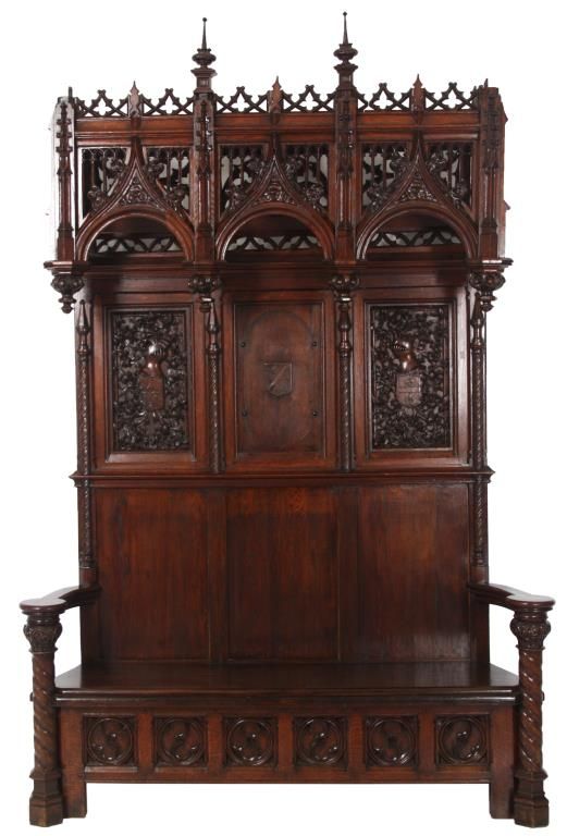 Continental Gothic Revival Oak Hall Bench, late 19th century, the hooded top with an arched gallery and pierced panels, the back with a panel with a heraldic crest flanked by panels with deep foliate-carving amidst crests surmounted by a knight's helmet, the plank seat fronted by spiral-twist columns and over a row of carved circular panels. 2 finials missing. 105 in. high x 67.5 in. wide x 20.5 in. deep.