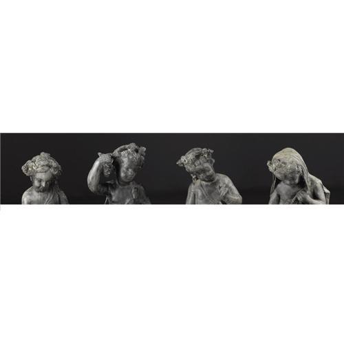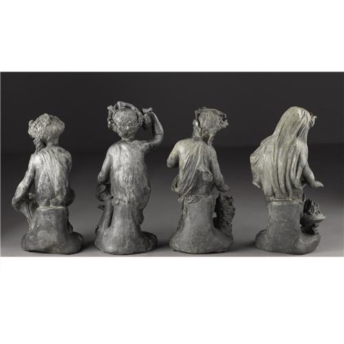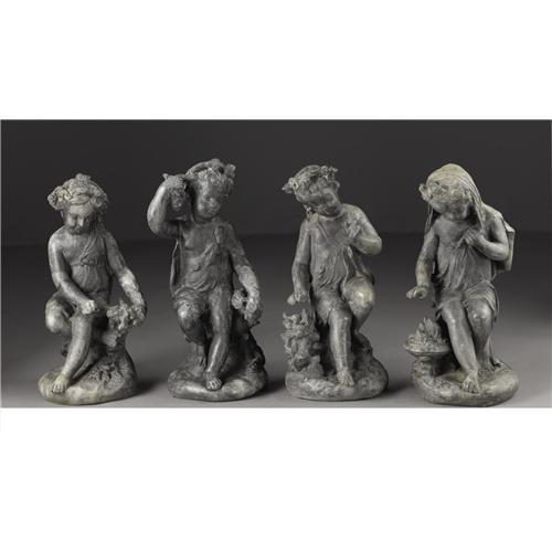 <B>A Continental Allegorical Figures Of The Four Seasons</B></I><BR><BR>Continental<BR>Nineteenth Century<BR>Lead<BR>18 in. high (each)<BR><BR>Four lead cast children, two boys and two girls, are each accompanied by an accouterment or action appropriate for the season, winter: in a robe with a fire burning, spring: feeding baby birds, summer: with grapes and fall: with wheat4 Items <BR><BR><B>Condition Report:</B> Normal signs of wear as appropriate with age and flaws to one hand